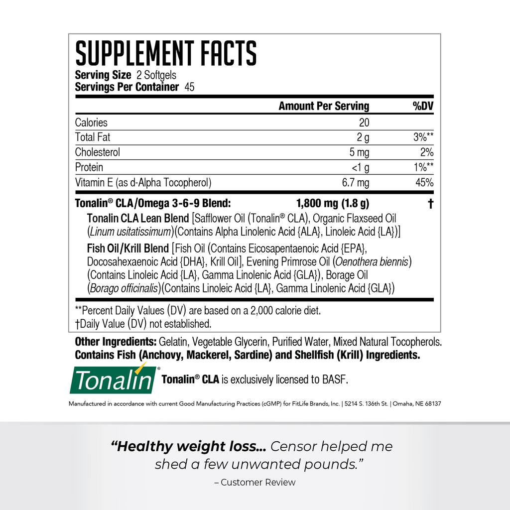 Effective Fat Loss Support with CLA: Censor offers much more than your average daily fish oil. The CLA in Censor helps tone and reduce body fat in four key ways: 1) it limits fat storage after meals, 2) accelerates fat breakdown in fat cells, 3) boosts fat metabolism, and 4) reduces the total number of fat cells in the body. This powerful combination supports your body’s natural fat-burning process and helps you lose the inches.
